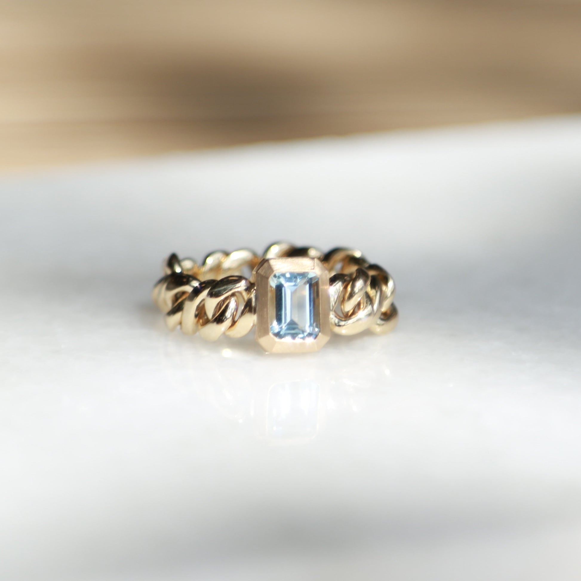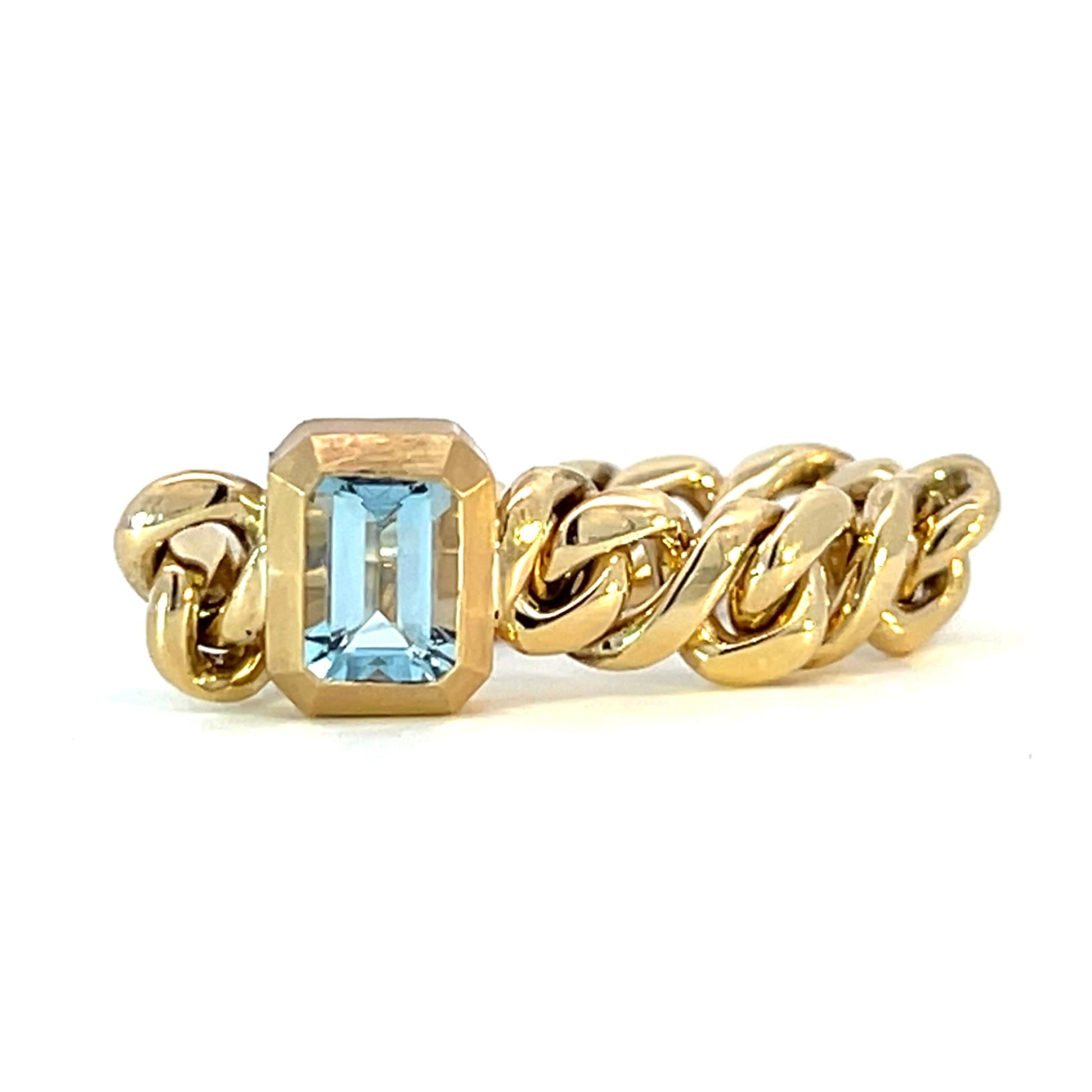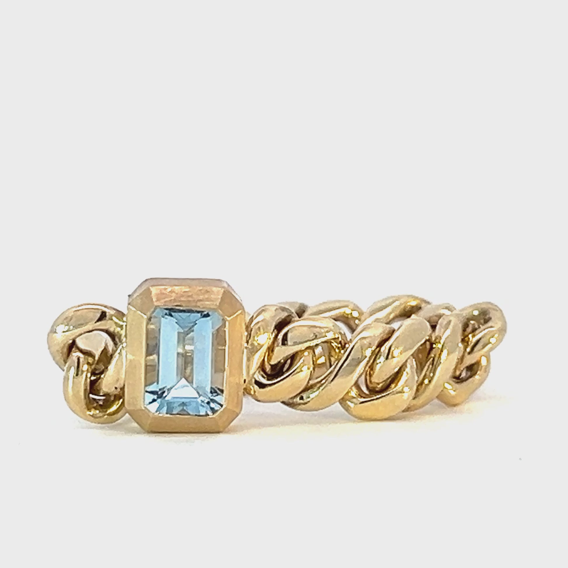 We've brought new life to this up-cycled 14k antique chain. We deconstructed a vintage bracelet to create a few truly one of a kind rings. Bezel set 0.88carat 7x5.1mm natural vibrant emerald cut aquamarine. High polish 14k yellow gold chain and brushed finish 14k bezel.
