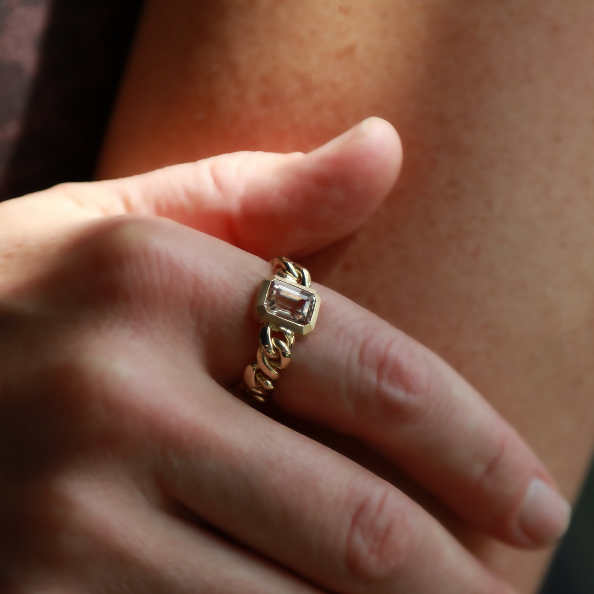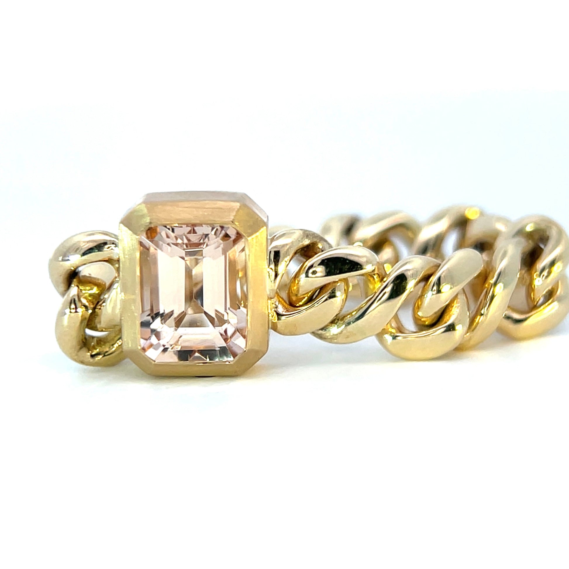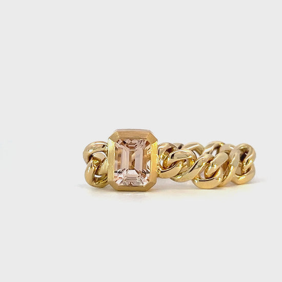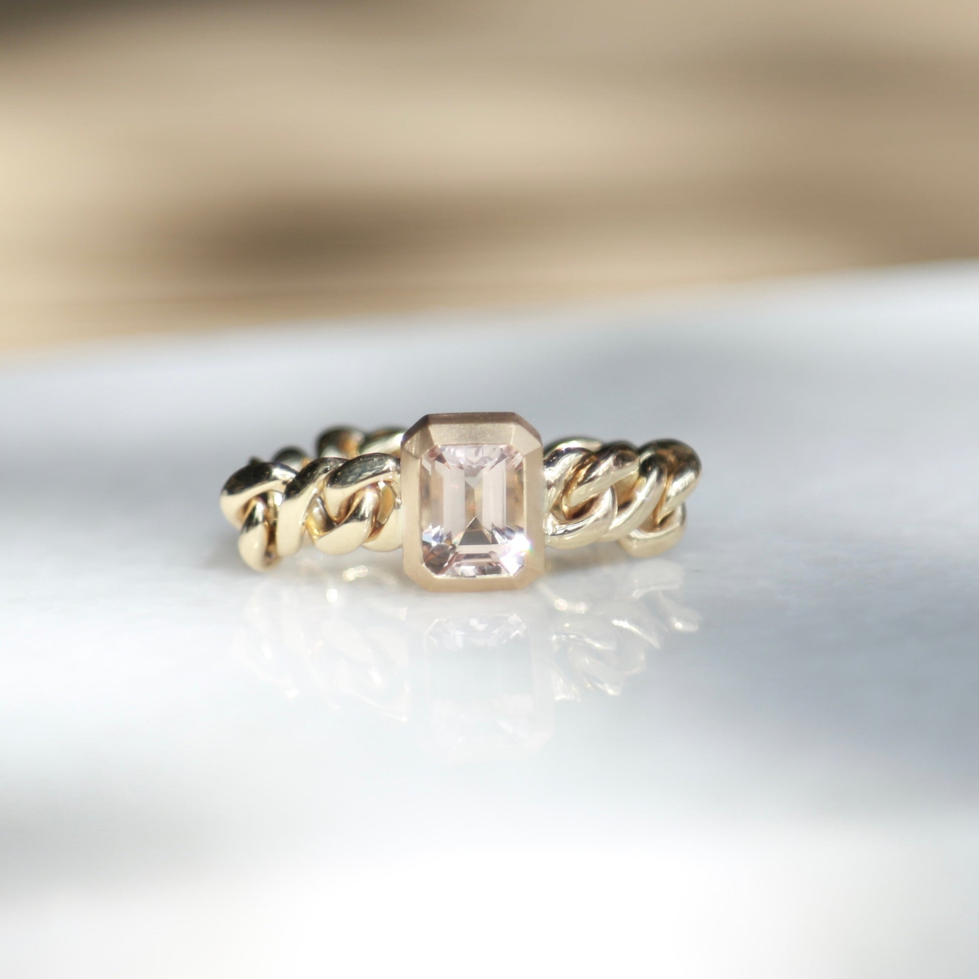 We've brought new life to this up-cycled 14k antique chain. We deconstructed a vintage bracelet to create a few truly one of a kind rings. Bezel set 1.58carat 8x6mm natural stunning emerald cut morganite. High polish 14k yellow gold chain and brushed finish 14k bezel.