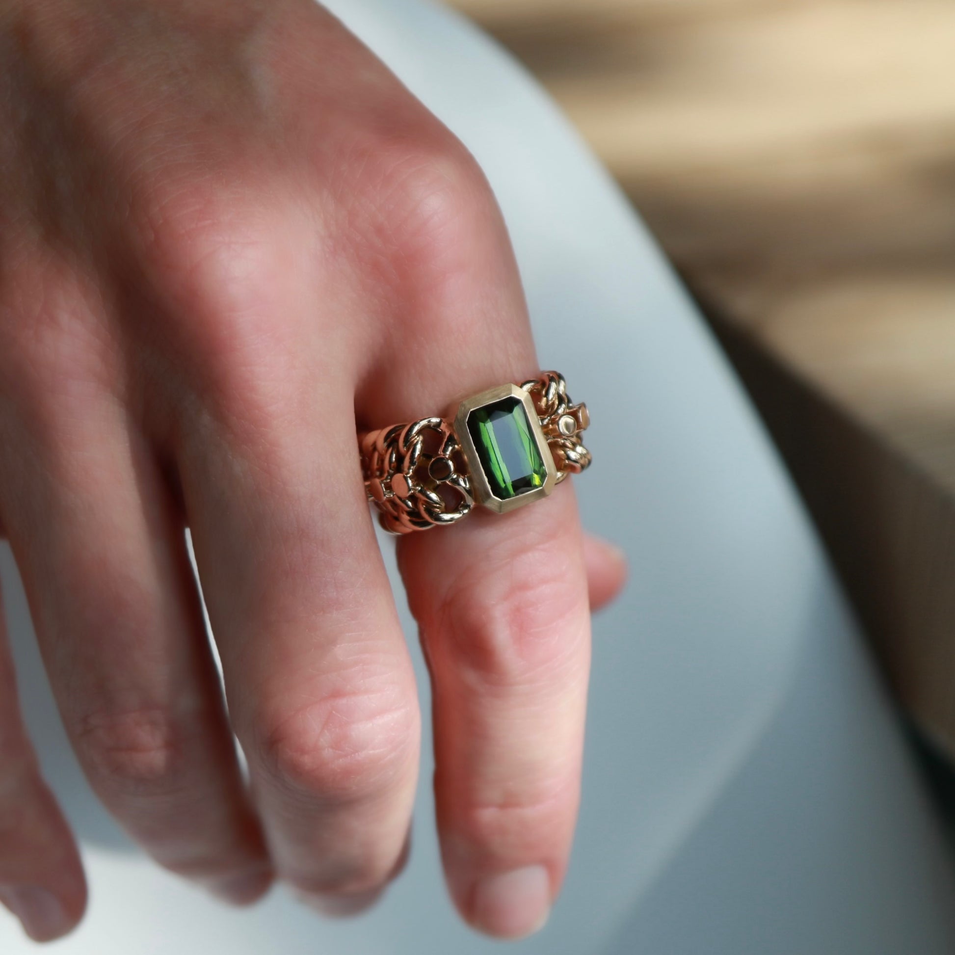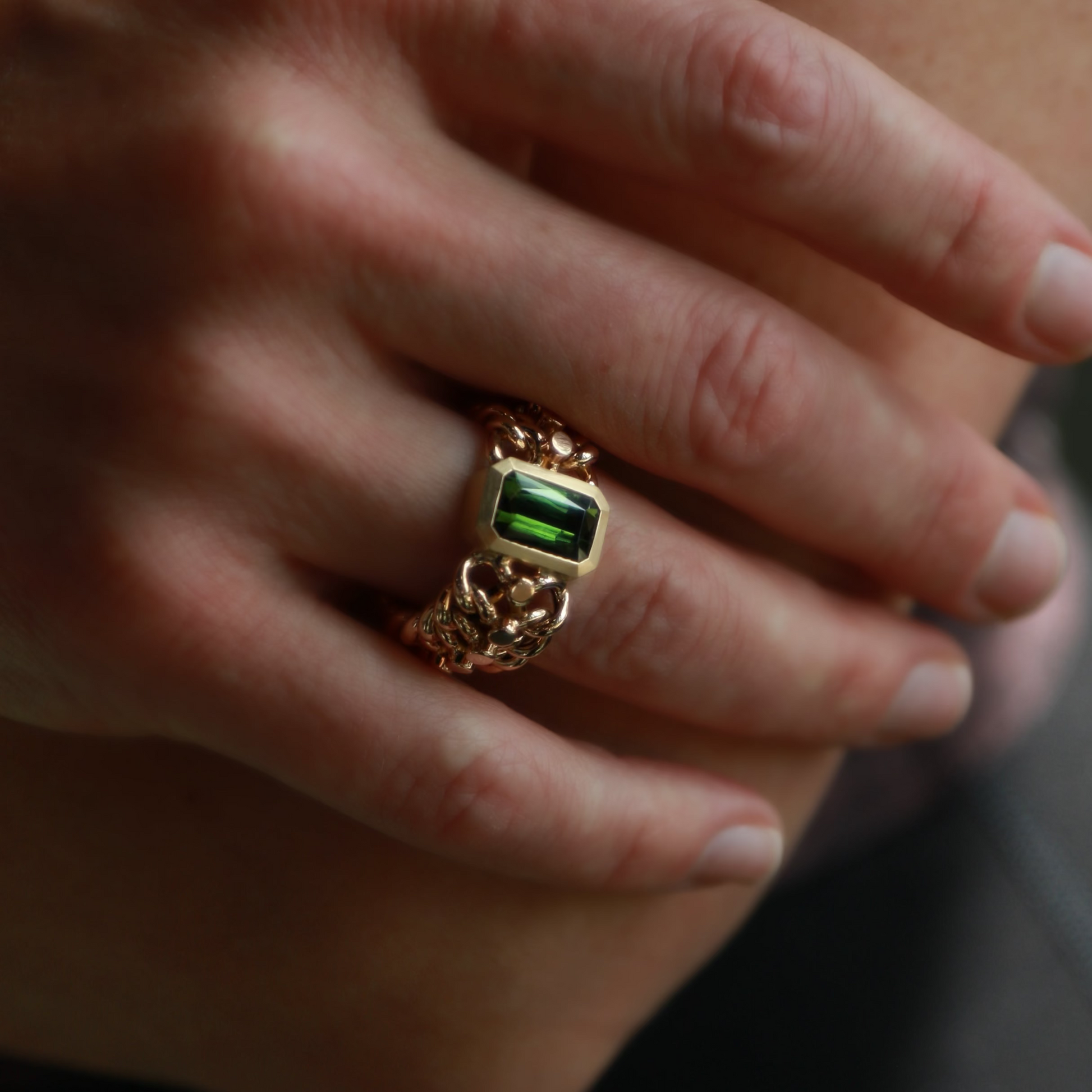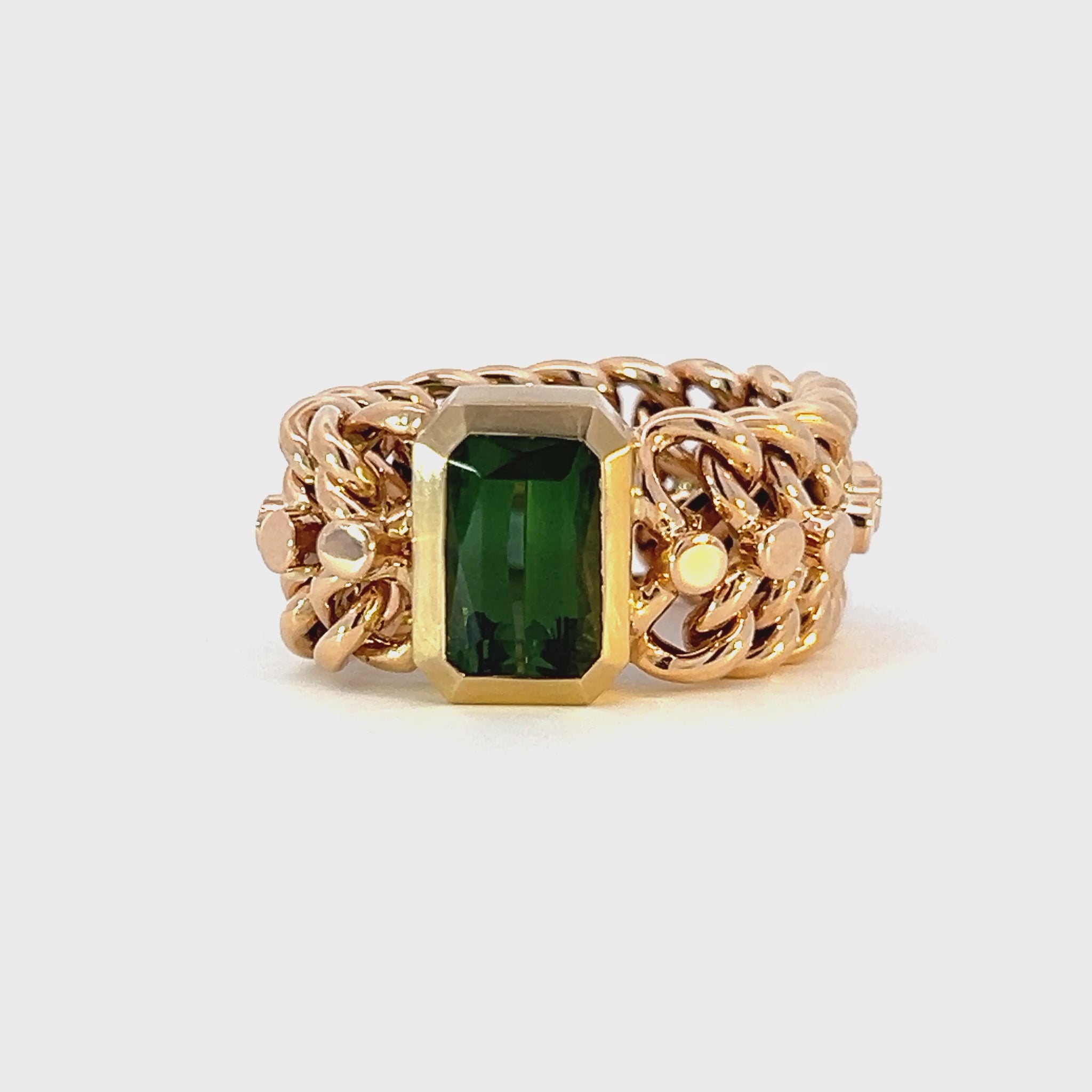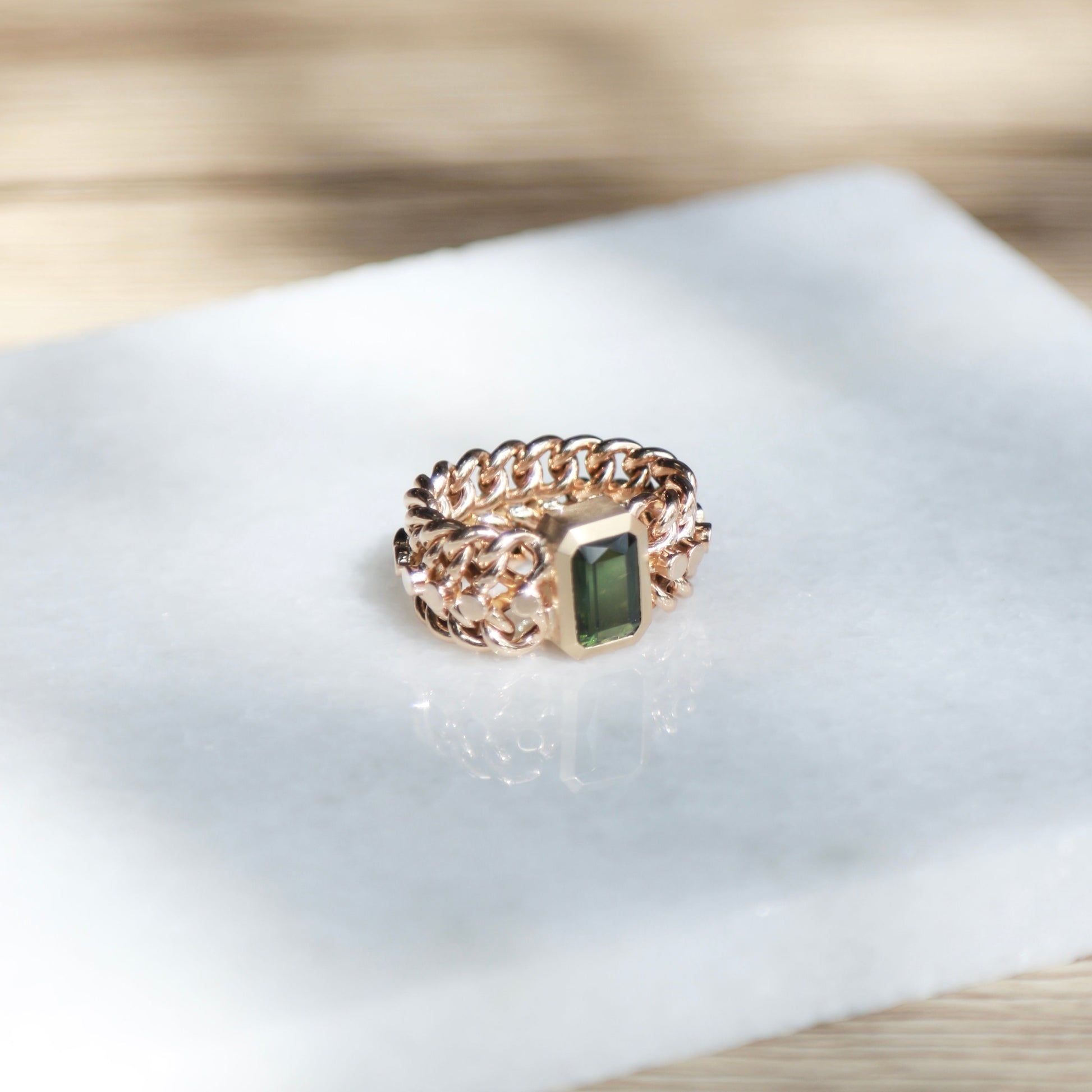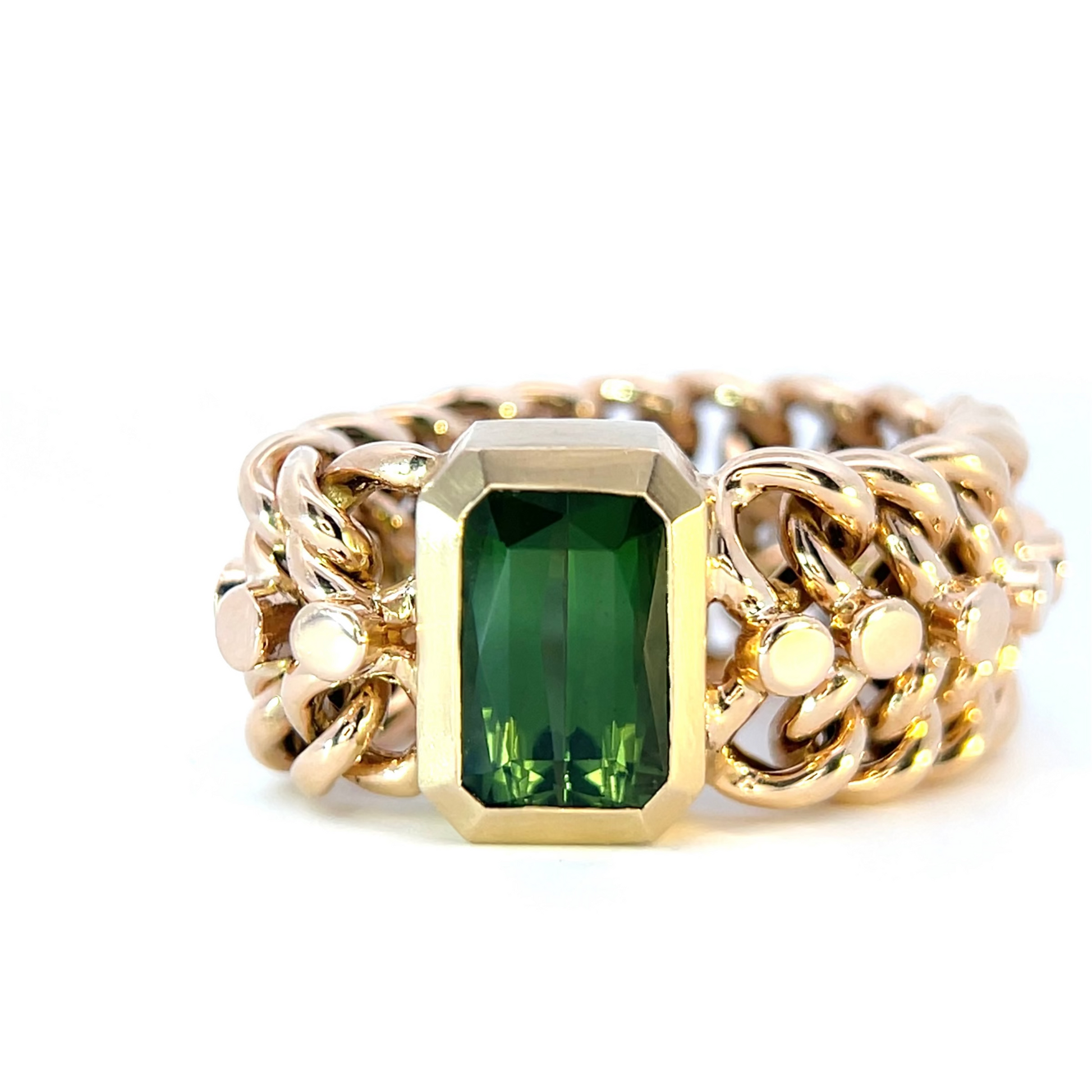 We've brought new life to this up-cycled 14k vintage chain. We deconstructed a vintage bracelet to create a few truly one of a kind rings. Bezel set 3.21carat emerald cut natural green tourmaline. High polish 14k yellow gold chain and brushed finish 14k bezel.
