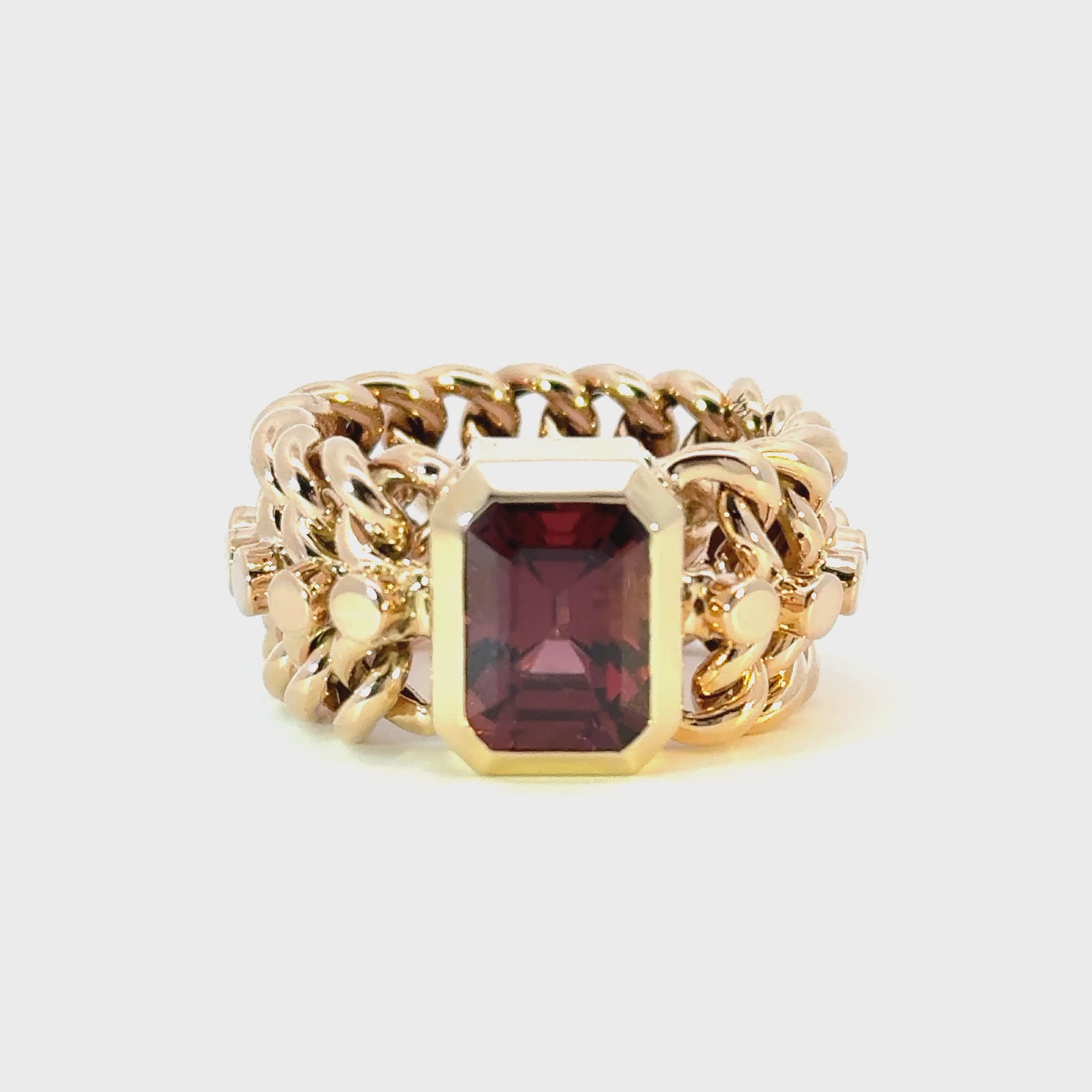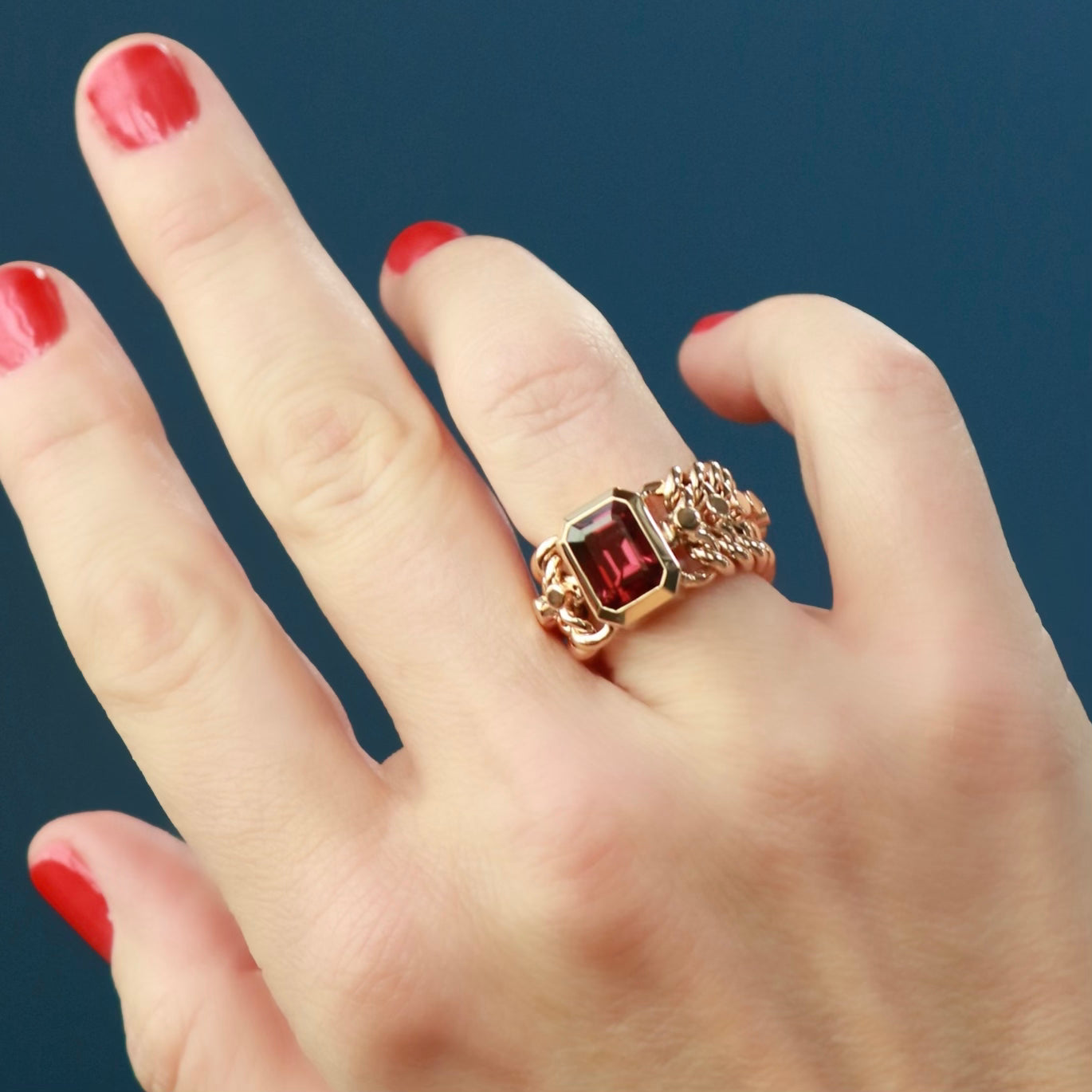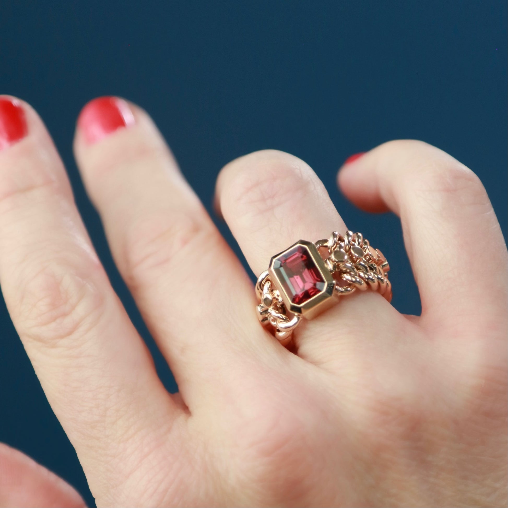 We've brought new life to this up-cycled 14k vintage chain. We deconstructed a vintage bracelet to create a few truly one of a kind rings. Bezel set 3.72 carat emerald cut natural red spinel. High polish 14k yellow gold chain and bezel.