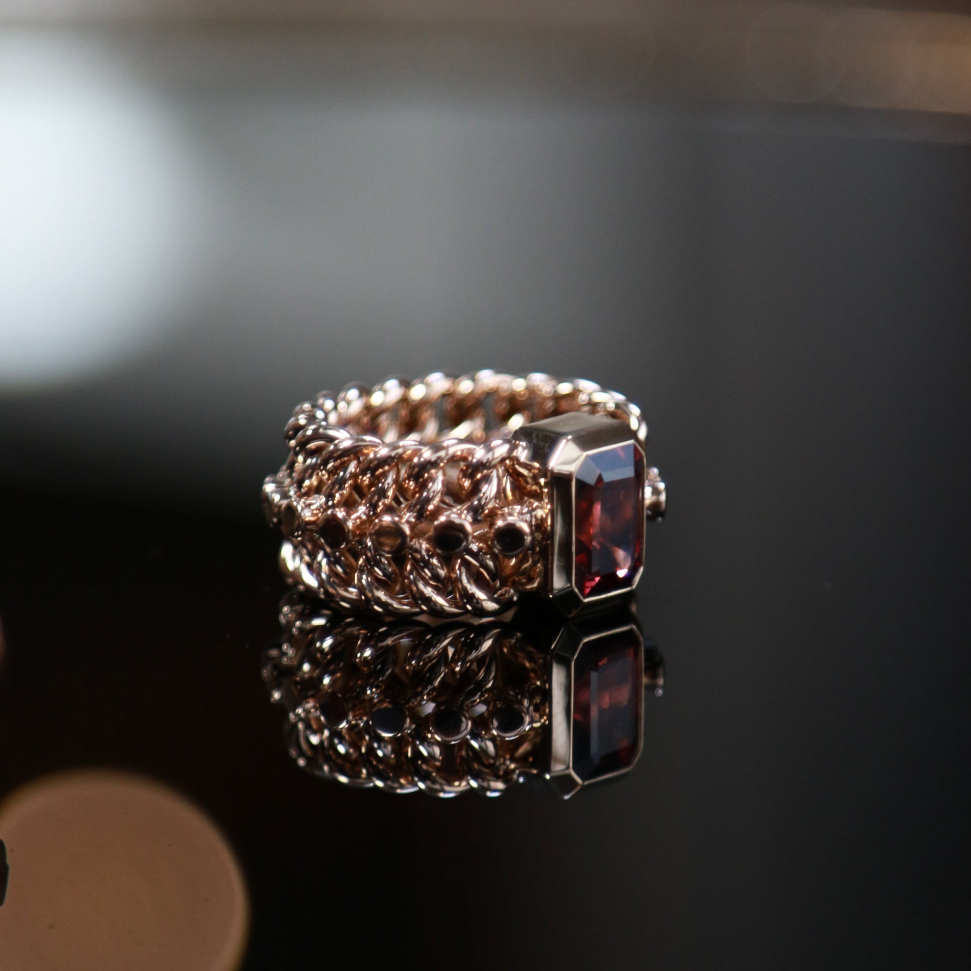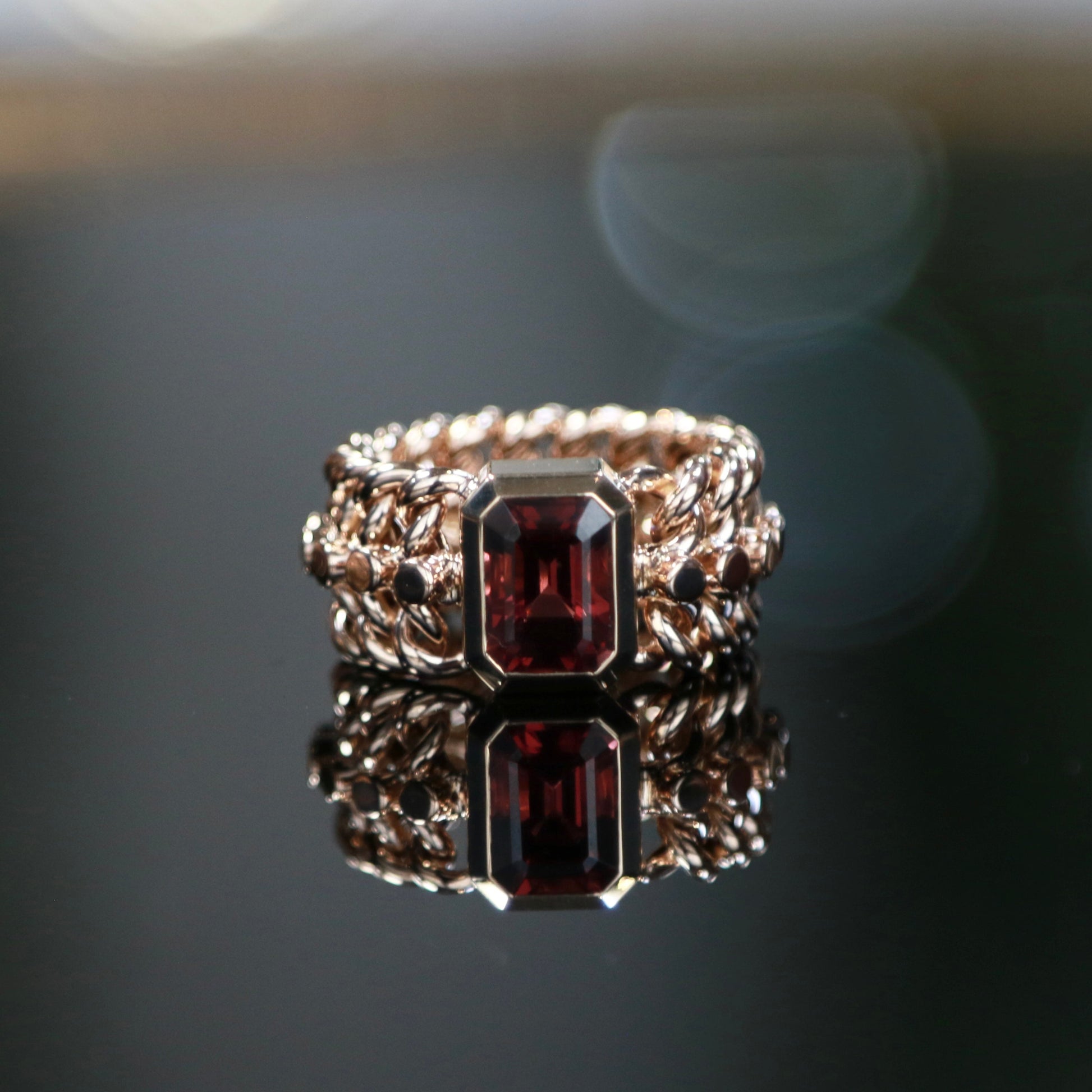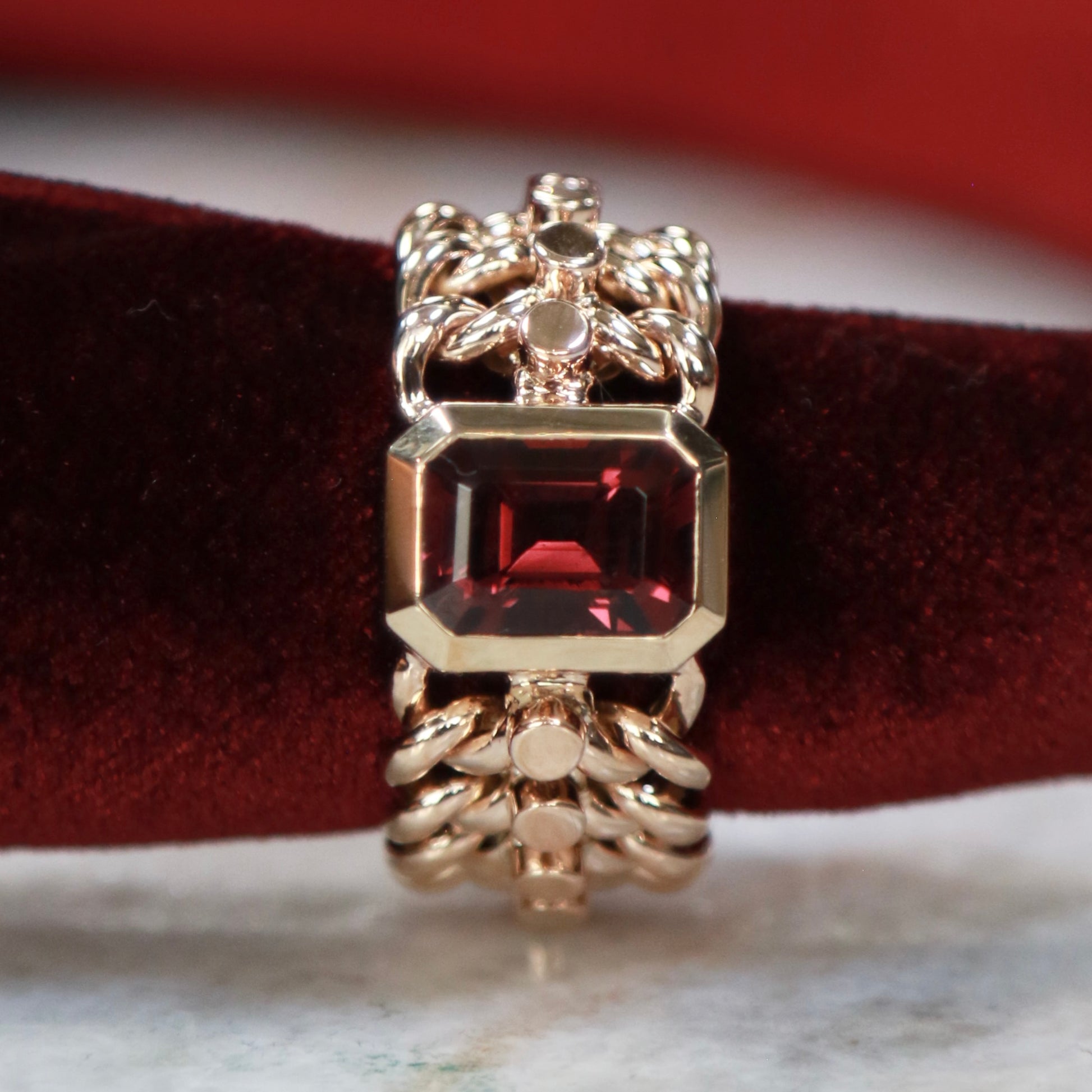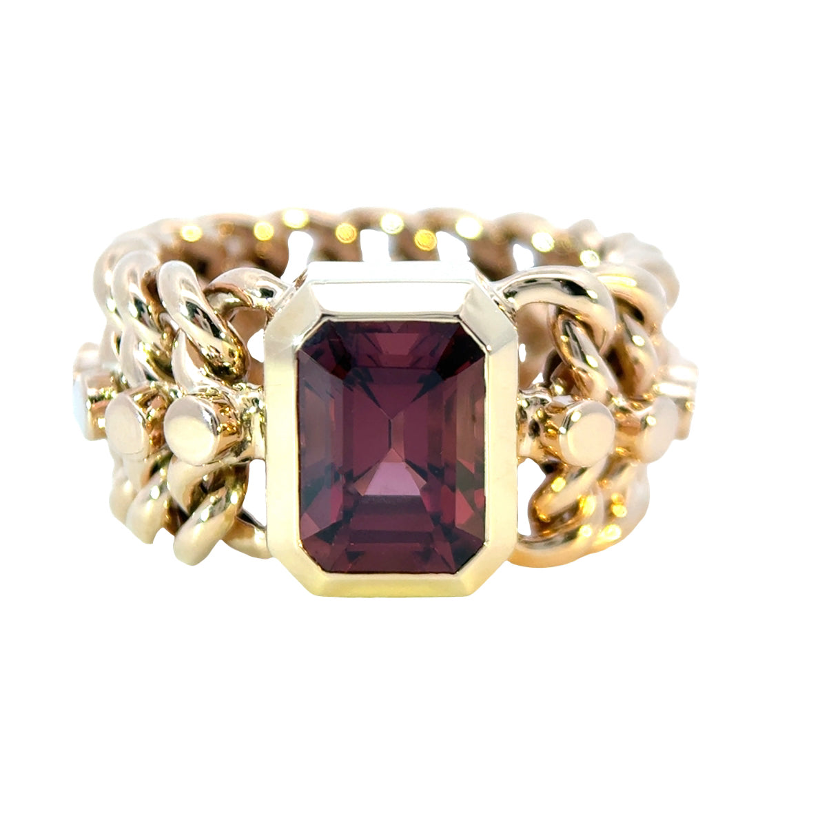 We've brought new life to this up-cycled 14k vintage chain. We deconstructed a vintage bracelet to create a few truly one of a kind rings. Bezel set 3.72 carat emerald cut natural red spinel. High polish 14k yellow gold chain and bezel.