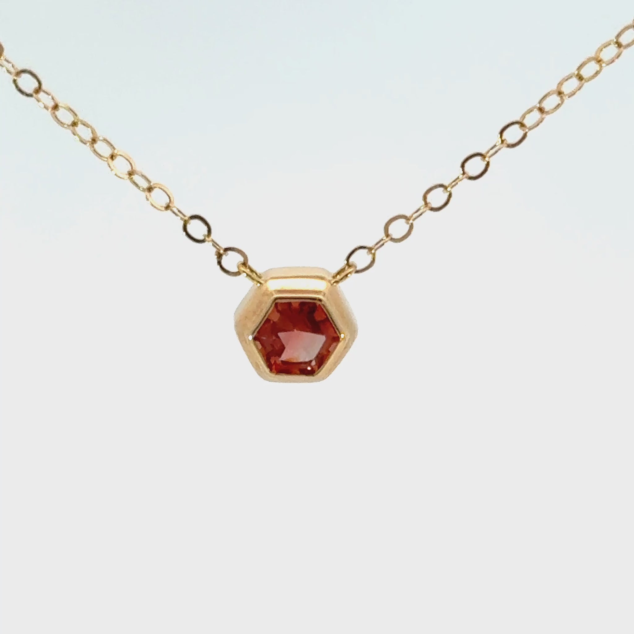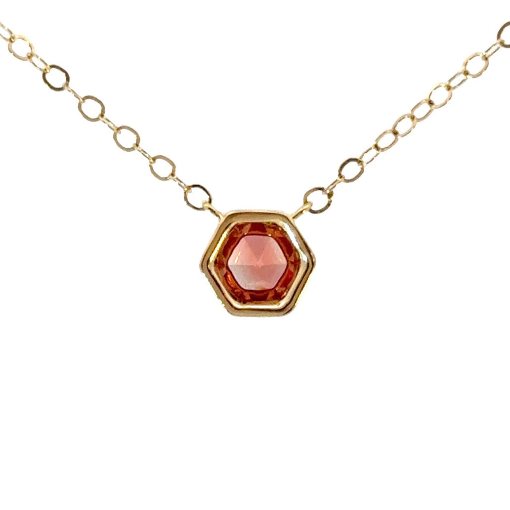 14k yellow gold bezel set orange Montana sapphire one of a kind necklace.